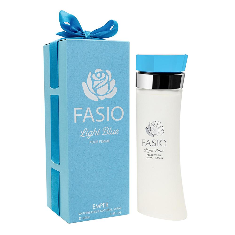 Zabawny flakon Fasio Light Blue Emper to brama do świata pełnego czarujących aromatów. Już samo opakowanie intryguje. Pudełko zdobi niebieska wstążka, która biegnie wzdłuż boków i jest elegancko zawiązana na górze w kokardę. Flakon jest wygięty i ma ciekawie zamkniętą nakrętkę. Wewnątrz kryje się kobieca, świeża kompozycja. Otworzy ona przed Tobą drzwi do sekretnego ogrodu, w którym już od pierwszych akordów poczujesz chłód sycylijskiej cytryny, świeżość zielonego jabłka i dzwonka łąkowego. Składniki wzmacniają się wzajemnie i powoli przechodzą w objęcia orientalnego jaśminu, drzewnego bambusa i szlachetnej białej róży. Wędrując po ogrodzie, dotrzesz do finałowych akordów, w których poznasz cedr, ambrę i piżmo. Wystarczy kilka kropel wody perfumowanej Fasio Light Blue Emper, aby zapomnieć o zamieszaniu. Zrelaksuj się i zanurz w tej cudownej aromatycznej kompozycji.